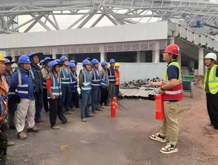 專題培訓(xùn)精準(zhǔn)滴灌Safety Production Month濟(jì)南黃河體育場(chǎng)項(xiàng)目創(chuàng)新采用短視頻等新媒體形式,結(jié)合“安全生產(chǎn)大家談”活動(dòng),讓工人直觀理解隱患后果;廣安項(xiàng)目針對(duì)夏季施工特點(diǎn),組織滅火器實(shí)操培訓(xùn),手把手教工友掌握“提、拔、握、壓”使用要領(lǐng);廣州白云機(jī)場(chǎng)項(xiàng)目開(kāi)展“高處作業(yè)與夏季施工安全”專項(xiàng)交底,結(jié)合機(jī)庫(kù)工程高空作業(yè)多、設(shè)備密集的特點(diǎn),詳解安全帶系掛規(guī)范與高溫防護(hù)要點(diǎn);瓊海項(xiàng)目則聚焦收尾階段風(fēng)險(xiǎn),開(kāi)展2次安全法規(guī)與操作規(guī)程培訓(xùn),覆蓋37人次,讓“幕墻鋁板調(diào)整防墜落”“密封膠作業(yè)防火星”等細(xì)節(jié)要求爛熟于心。