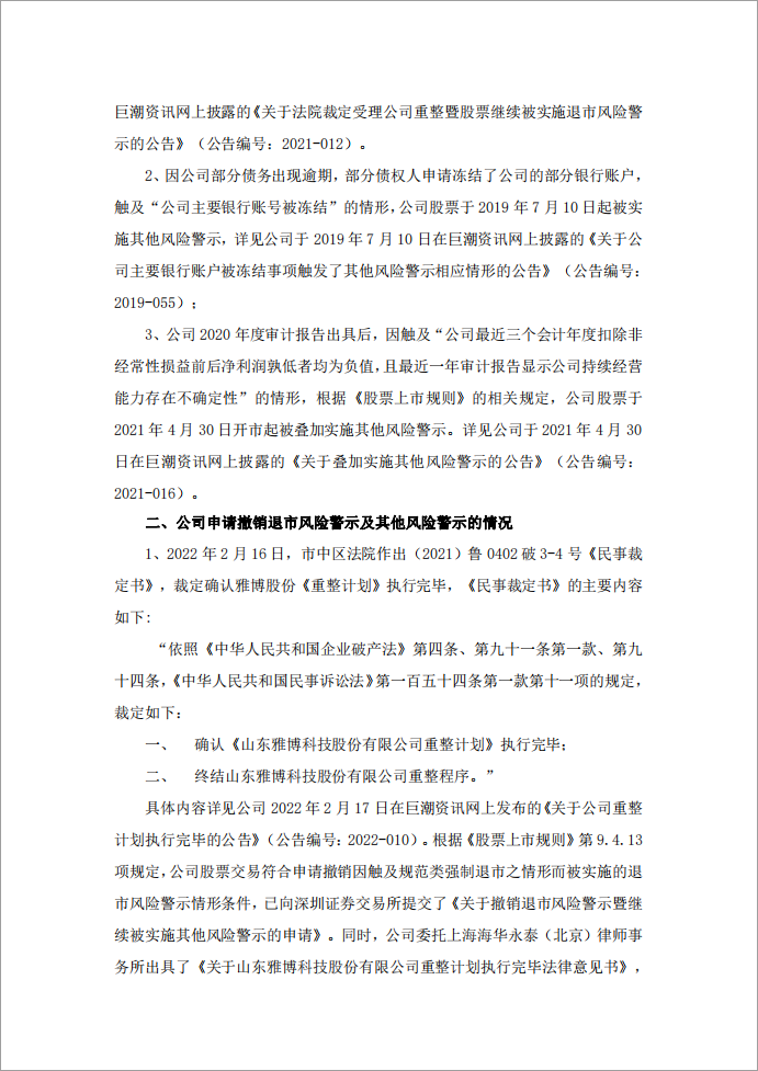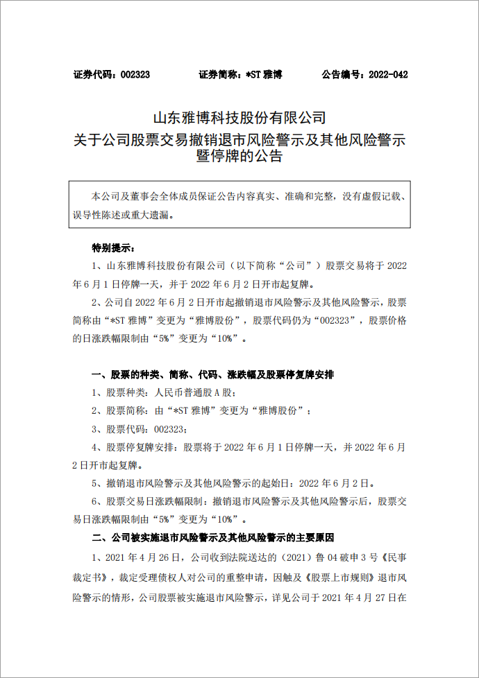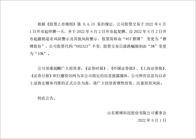 5月31日,深交所核準(zhǔn)同意了雅博股份撤銷退市風(fēng)險(xiǎn)警示及其他風(fēng)險(xiǎn)警示的申請(qǐng),這意味著公司即將完成摘星脫帽工作。公司股票交易將停牌一天,并于6月2日開市起復(fù)牌。其后,公司股票簡(jiǎn)稱將由“*ST雅博”變更為“雅博股份”,股票代碼為“002323”,日漲跌幅限制由“5%”變更為“10%”。