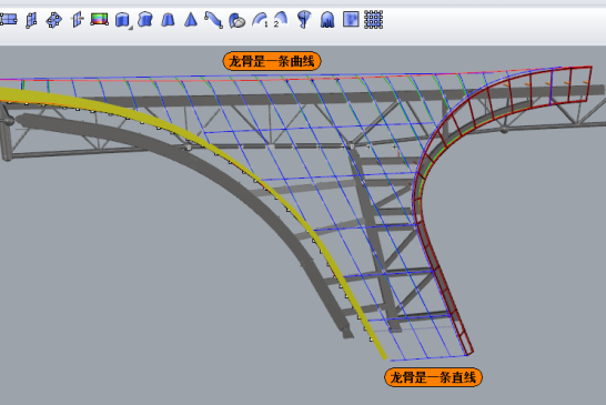 項目落地柱曲面是屋面裝飾板延伸到地面的瀑布造型,在頂部裝飾板是曲面造型,而在底面逐漸漸變成平面,在這個過程中,面板曲率逐漸減小直到為零。項目部在設計環(huán)節(jié)保證曲面到平面過渡順滑,在施工環(huán)節(jié),依據(jù)模型控制好龍骨坐標點位,完美地呈現(xiàn)了項目效果。