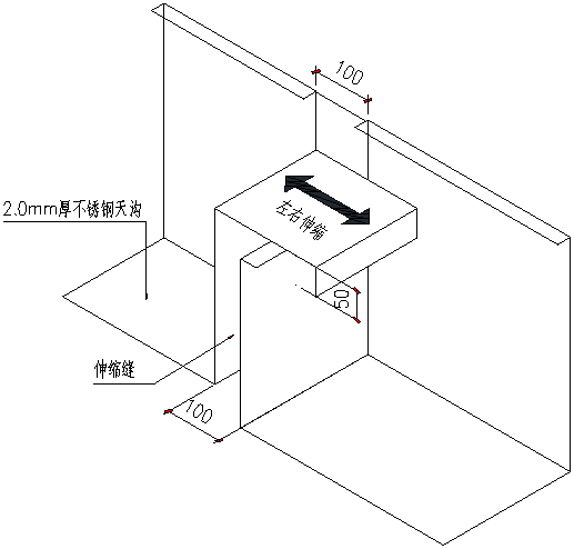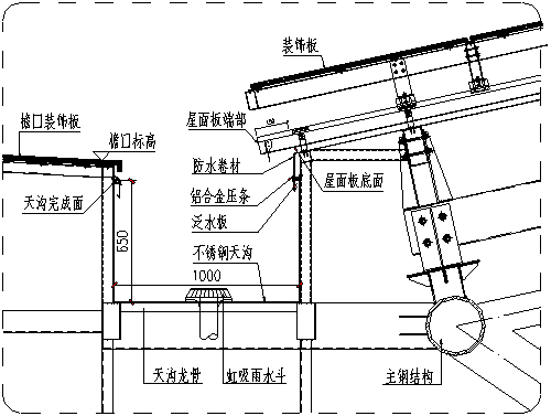 不規(guī)則的屋面提升了北京大興國際機場整體的美感,但同時也讓屋面排水設計更加復雜,想要將整個屋面系統(tǒng)的雨水變成有組織的排水,必須采用不銹鋼天溝+虹吸式排水系統(tǒng)相結(jié)合的處理方式,由于屋面板與不銹鋼天溝是兩種不同的材質(zhì),并且方向不同,在熱脹冷縮的影響下,兩處結(jié)合部位極易出現(xiàn)漏水隱患。項目部在天溝沿著長度方向每間隔30米左右設置一條伸縮縫,同時保證該段部位的虹吸斗數(shù)量不少于2個,以此來解決天溝熱脹冷縮而出現(xiàn)的焊縫被拉裂問題。對于屋面板與不銹鋼天溝連接部位的防水,采用泛水板進行防水,以泛水板固定在天溝龍骨上,呈倒勾狀與天溝板構(gòu)造連接,并且在外側(cè)設置第二道防水措施防水卷材,保證雨水順利流入天溝排進地面雨水管網(wǎng),全面杜絕漏水隱患。