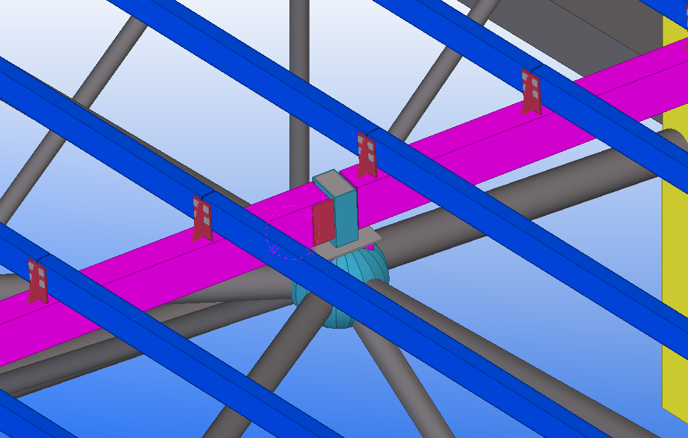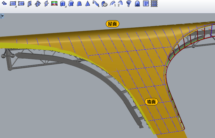 漸變的曲面屋頂是項目的亮點,也是項目的難點之一。在深化設計階段,項目部先采用BIM技術(shù)進行三維空間模擬,用Rhino+Grasshopper參數(shù)化依次確定主次檁條的空間樣條曲線,依據(jù)順滑的樣條曲線來實現(xiàn)3D實體的模擬,使用相關(guān)軟件結(jié)合設計圖紙進行實體碰撞檢查,完成節(jié)點部位的3D設計,檢查完成無誤后進行出圖。